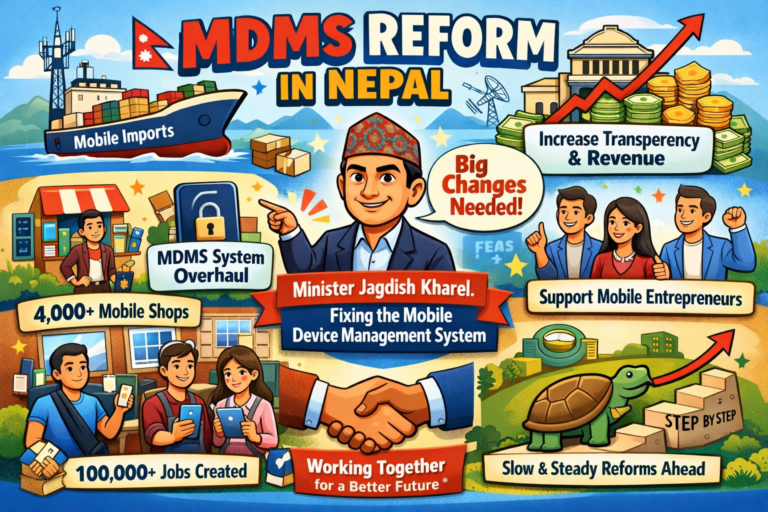 Minister Kharel explained that fixing the MDMS system will not happen fast. It needs slow but strong steps. This will help make things clear in government revenue from mobile phones and fair for mobile entrepreneurs.